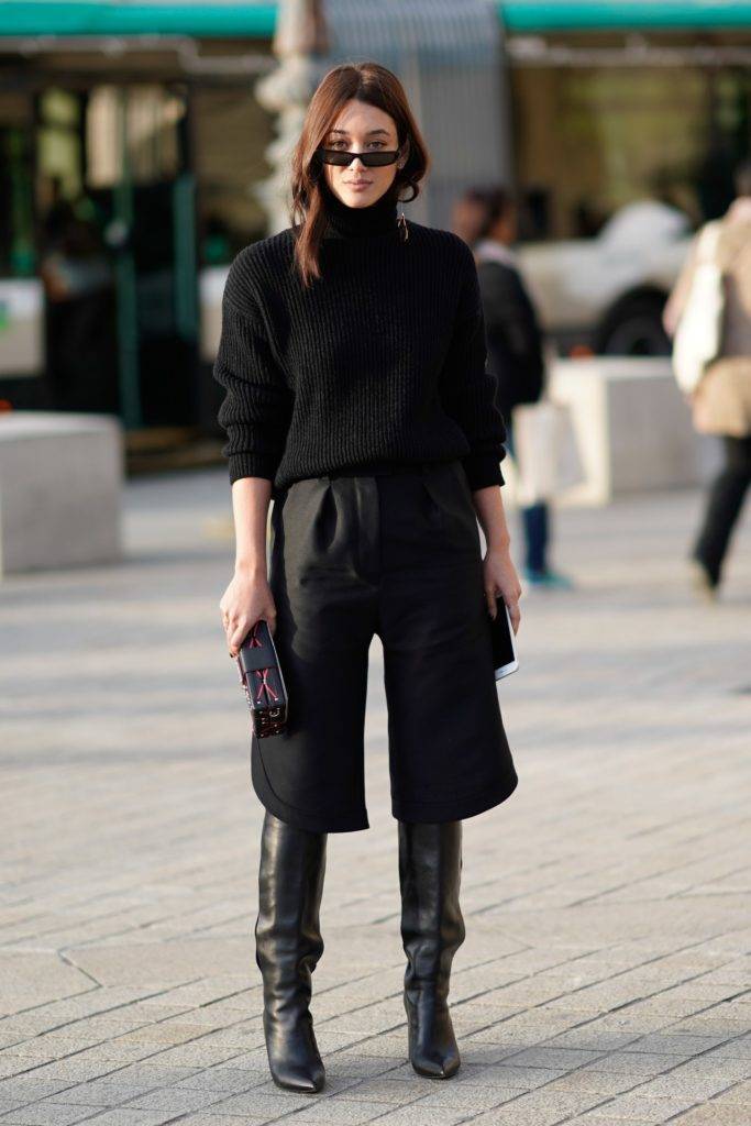 - Высокие сапоги: до колен, или сапоги которые по высоте чуть ниже колена являются идеальными для ношения с короткими штанами. Это сочетание идеально подходит для осени и может носиться с колготками или на голые ноги.