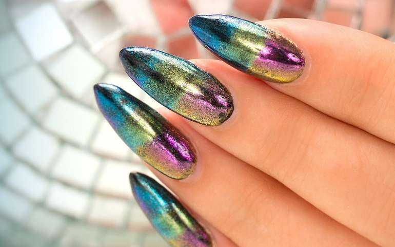 - Омбре с втиркой и пигментами. Пигмент вбивается кисточкой в уже высушенную растяжку.