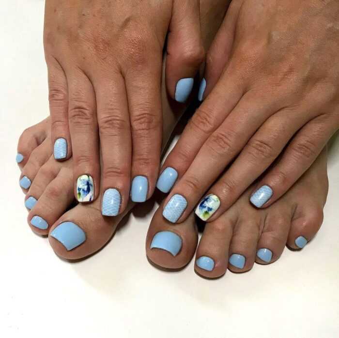 Маникюр и педикюр в одном стиле с рисунком на одном пальце