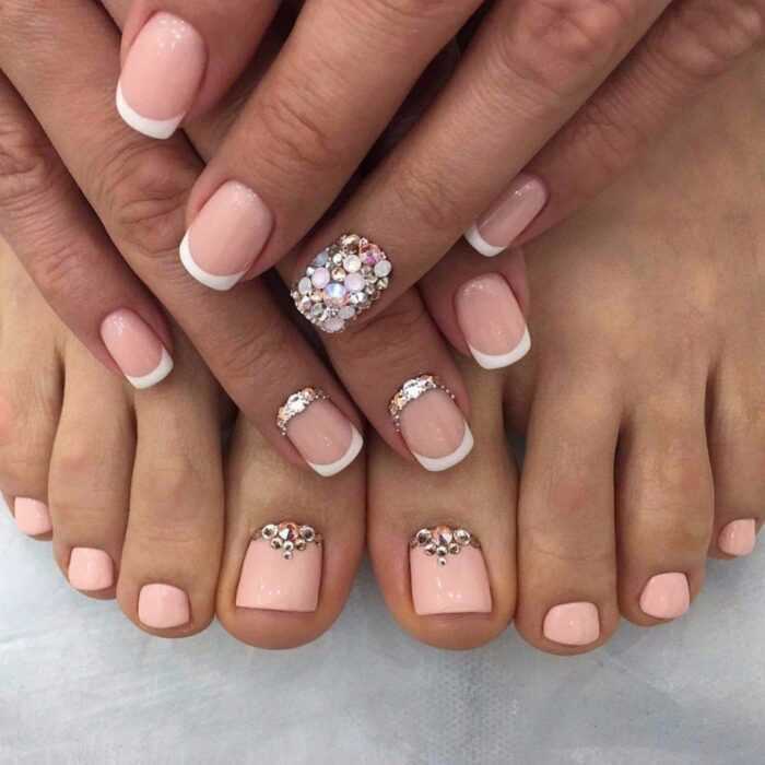 Одним из самых крутых вариантов считается белый маникюр и педикюр со стразами. Сюда также можно добавить цветы в технике акварель. Необычные разводы будут смотреться нетривиально и эстетично. Стразы лучше добавлять у края ногтевой пластины в небольшом количестве.