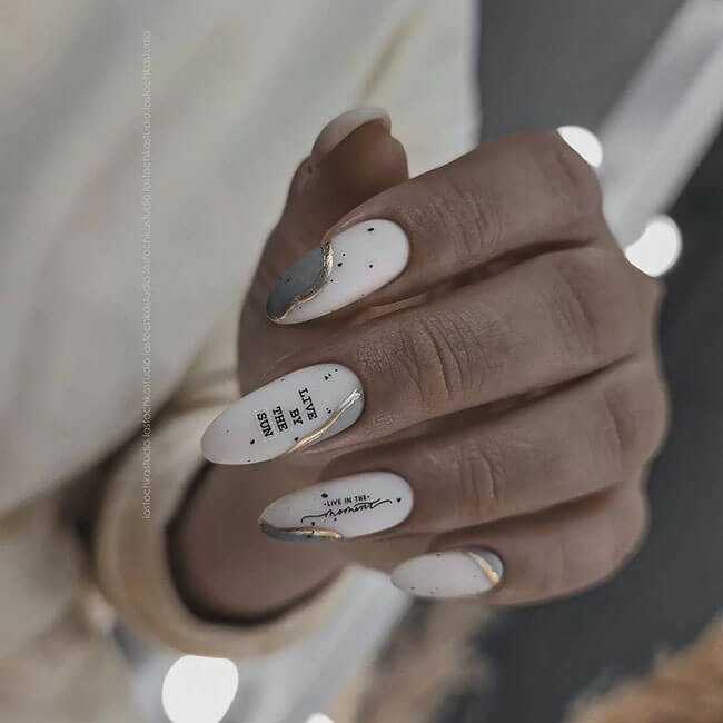 Согласимся, что сочетание белым лаком для ногтей интересных слов, пожеланий и изречений идеально подходит в качестве рисунка, ведь на белом фоне любая надпись выглядит четко и лаконично.