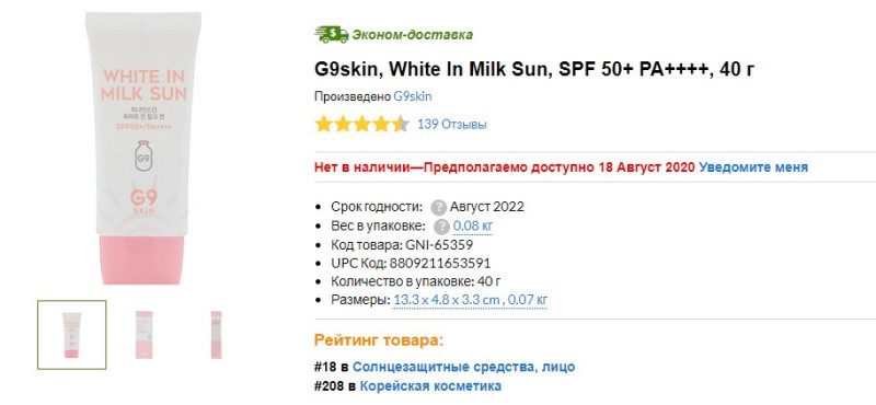 Степень защиты с фильтром spf 50 считается высокой, такие средства часто «тяжелые», наносятся с трудом, а G9skin White In Milk:
