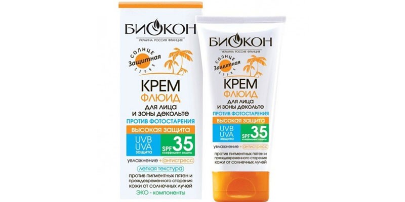 - Бюджетная – Биокон флюид для лица и зоны декольте SPF 35.