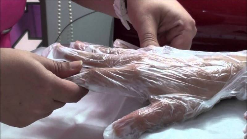- Покрой полученным составом руки. Потом заверни кисти сначала пищевой пленкой, а затем утепли махровым полотенцем. Это поможет маске проникнуть более глубоко.