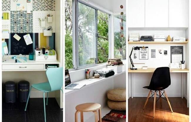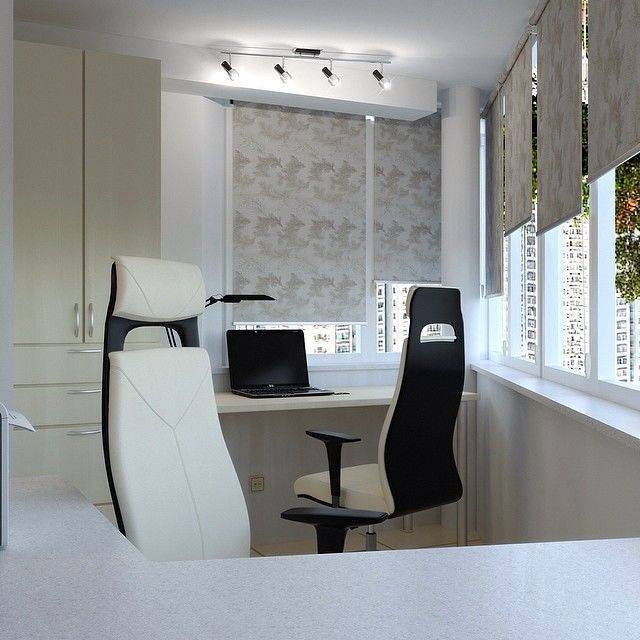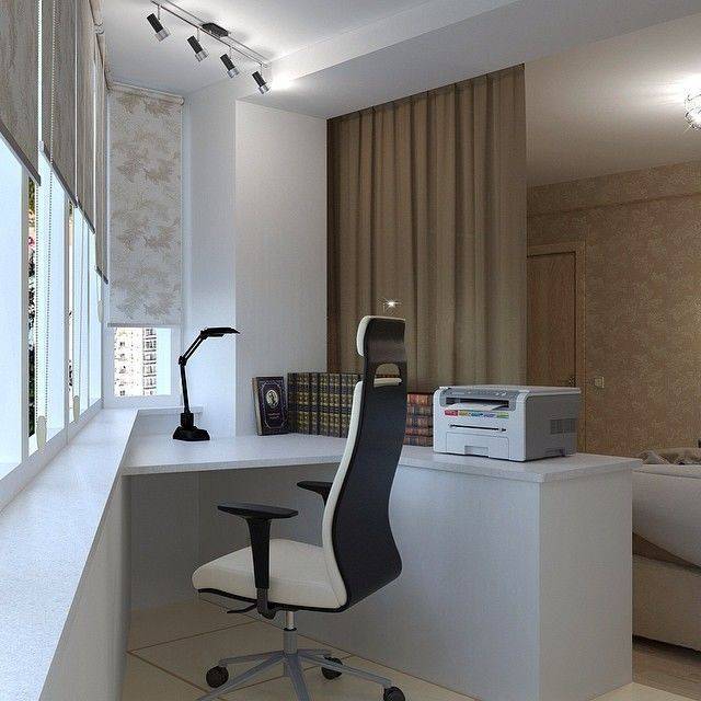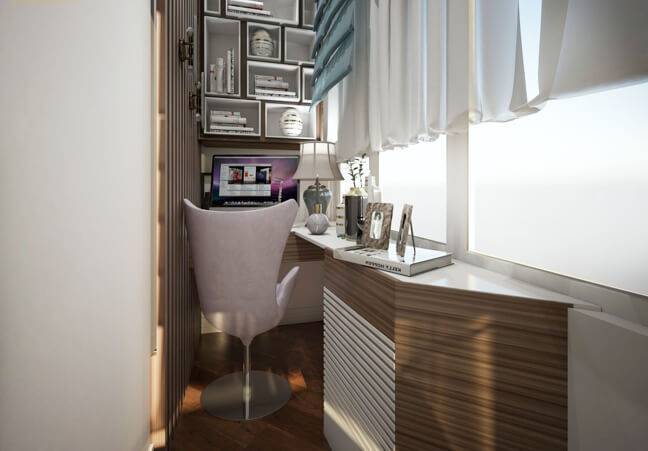 В хрущевках выше первого этажа бывает балкон — согласуйте перепланировку в БТИ, снесите перегородку и устройте кабинет в квартире на освободившемся пространстве. В двушках такого типа есть мини кладовая — примерно 2 кв. м. Хватит места, чтобы встроить столешницу, поставить ноутбук и легкий компьютерный стул. Полки лучше вынести за пределы кладовой — в ней итак мало воздуха.