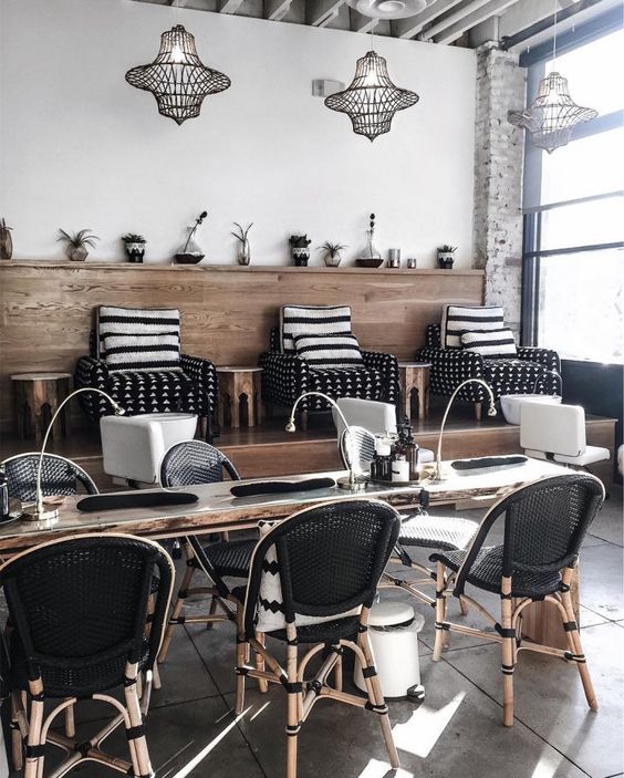 В дизайне интерьера маникюрного салона важно предусмотреть удобный доступ к месту мастеру и клиенту. На каждом столе должна быть настольная лампа