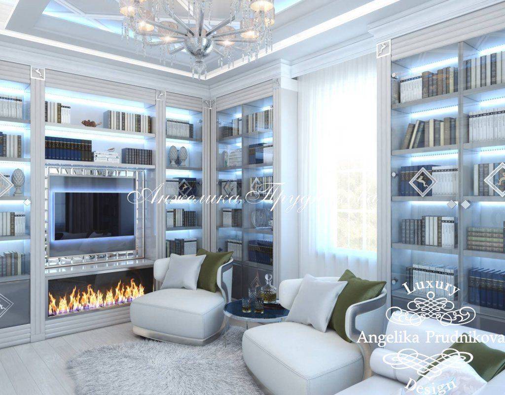 А в дизайне кабинета в стиле арт-деко в загородном доме был организован встроенный стеллаж, занимающий пространство вдоль одной из стен. Темно-коричневое дерево с крупным ромбическим рисунком «перекликается» с отделкой ТВ-зоны, что способствует формированию единства пространства. Встроенный биокамин добавляет зоне библиотеки уюта, формируя современную стилизацию на тему старинной английской гостиной с вольтеровскими креслами и классическим очагом.