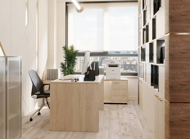 Освещение кабинета должно быть верхним и рассеянным. А рабочее место с компьютером должно иметь источник отдельного света. Эту роль может отлично выполнить настольная лампа.
