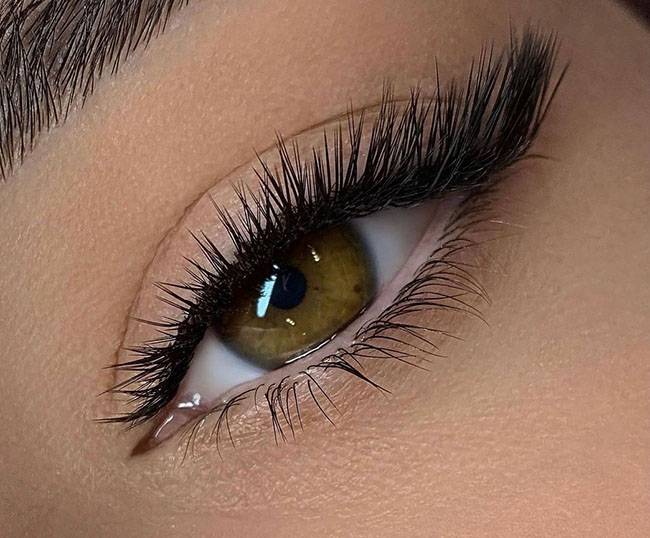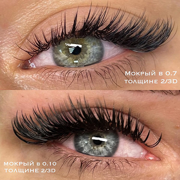 Мокрый эффект — достаточно яркий, но смотрится натурально. Создается путем 100% заполнения всех ресниц верхнего века нераскрытыми пучками из двух или более ресниц. Получается эффект слегка слипшихся ресничек.