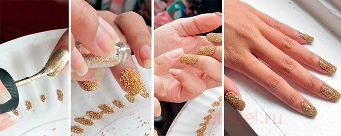 Бульонки выкладываются на свежий лак, гель или незастывший акрил слегка влажной апельсиновой палочкой, хаотично или в любом выбранном вами узоре. Бусинками хорошо создавать границу какого-либо рисунка. После того, как вы выложили бульонки на поверхность ногтя, дайте лаку высонуть, чтобы бусины прочно зафиксировались, а затем покройте финишным покрытием.