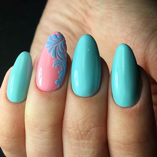 - Свободный край среднего и безымянного ногтей украсьте треугольниками цвета бирюзы.