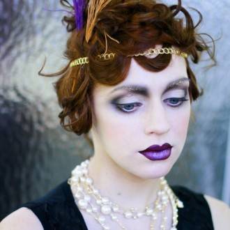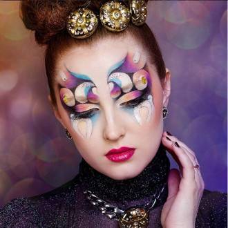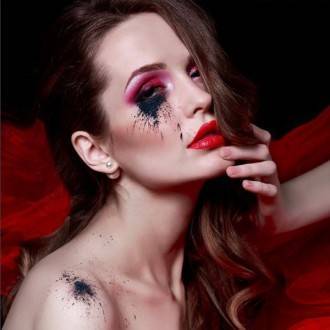 - Нанесение косметики и грима. В первую очередь наносят тени, подводку и тушь (при необходимости прикрепляют накладные ресницы). Далее лицо покрывают гримом и красят губы, добиваясь желаемых эффектов (например, можно добавить кровь).
