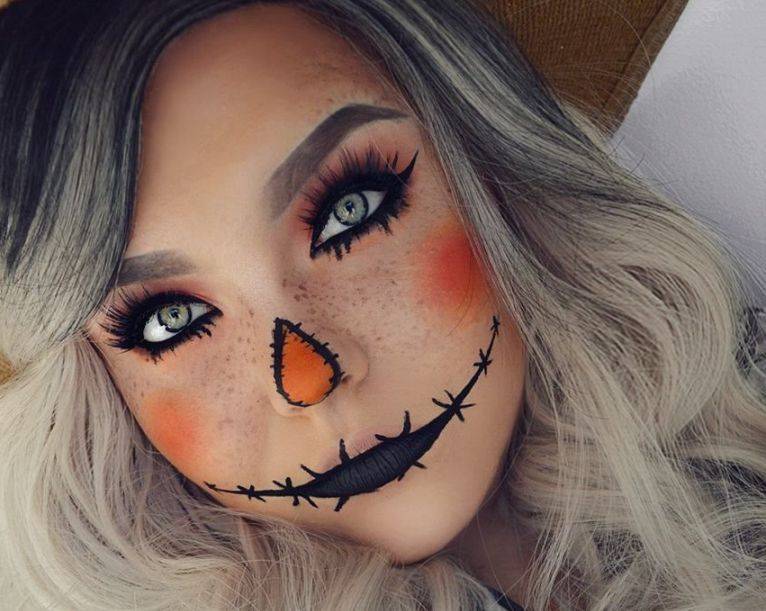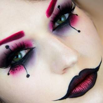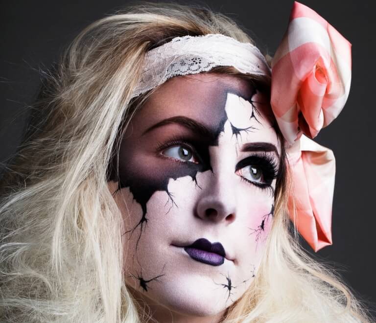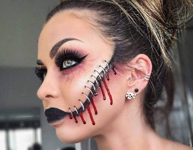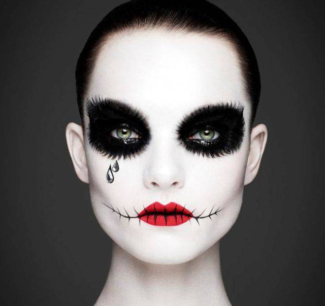 Не менее популярен на Хэллоуин и образ куклы из знаменитого фильма «Пила». Такой макияж подходит и парням, и девушкам. Причем, девушки выглядят более эксцентрично.