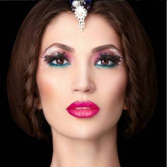 После следует перейти к закреплению аппликации из камней, страз и пайеток в виде морозного узора на лбу