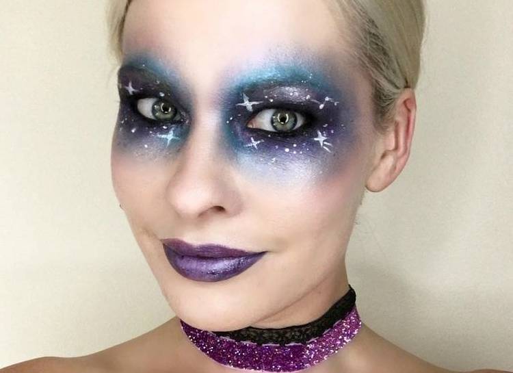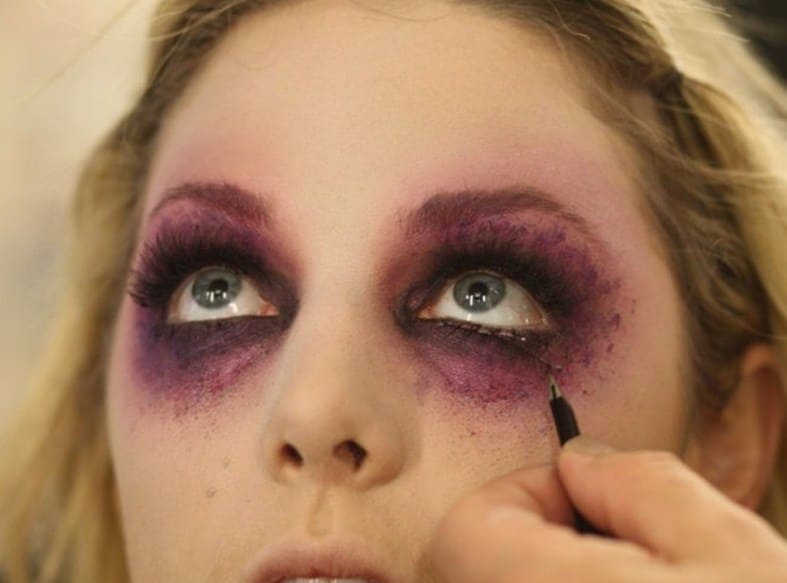 Тщательно замаскированные в обычной жизни, для Хэллоуина «синяки» нужно будет увеличить с помощью серо-черных или фиолетовых теней. В сочетании с «горящими» глазами это создаст необычный образ.