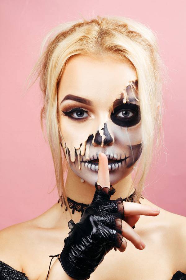 Совершенно необязательно стремится к природным контурам: стилизованный скелет на вашем лице также даст ясно понять, кого вы представляете в эту ночь. Кстати, оригинальным решением является и макияж скелета на Хэллоуин всего лишь на пол-лица. Так вы даете людям шанс разглядеть не только ваши художественные таланты, но и природную красоту лица.