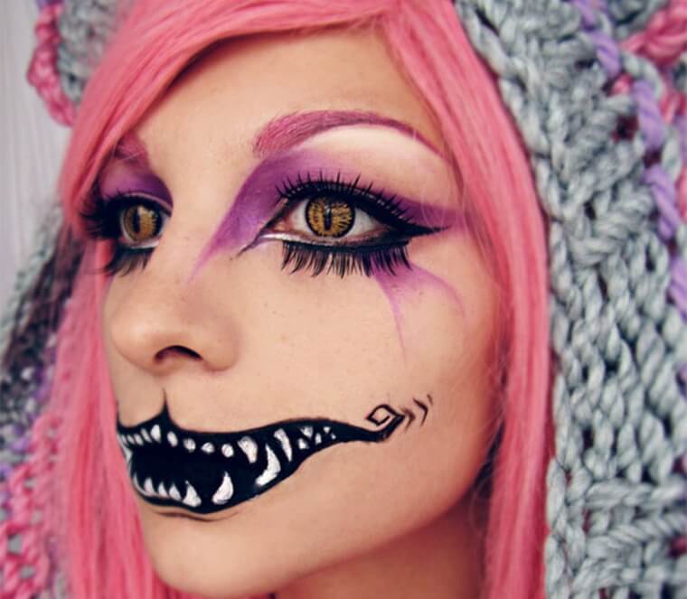 Как накраситься на Хэллоуин девушке, предпочитающей экстравагантные образы? Предлагаем вариант Чеширского кота, а точнее, кошечки. Волосы вы можете заколоть так, как вам удобно. Цвет волос выбирайте в зависимости от того образа кота, который вам ближе (серо-голубой кот из фильма Тима Бёртона или классический розово-фиолетовый из мультфильма Уолта Диснея). Придать нужный оттенок волосам помогут тоники, цветные мелки для волос, ну и классика жанра – парики.