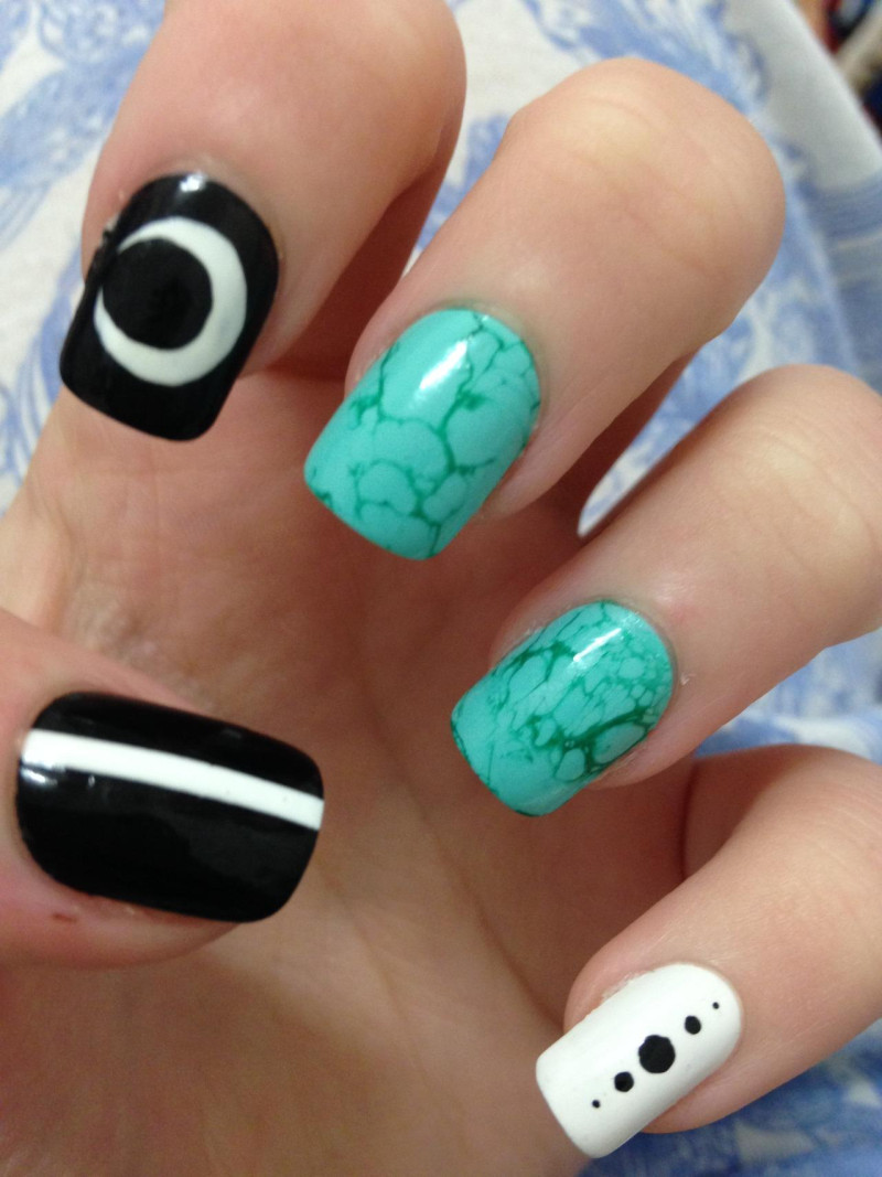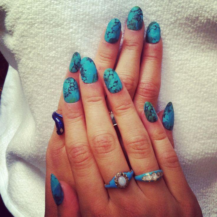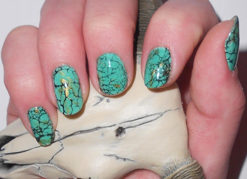 Такой яркий вариант мраморного маникюра придется по душе любительницам украшений из бирюзы.