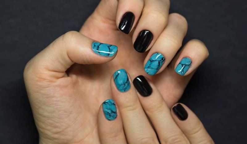 Оттенки цвета морской волны потрясающе смотрятся в мраморном дизайне ногтей.