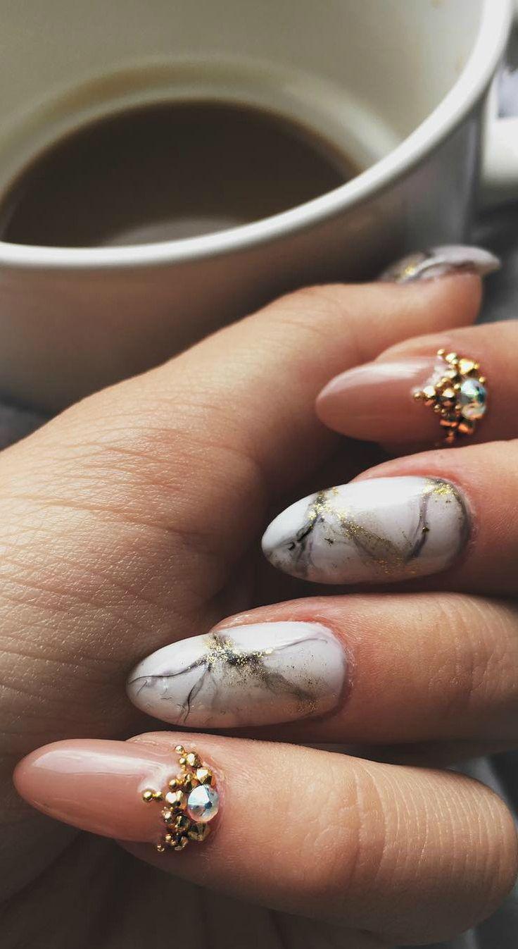 Необычная форма ногтей и декорирование камнями сделает ваш мраморный маникюр невероятно модным и стильным.