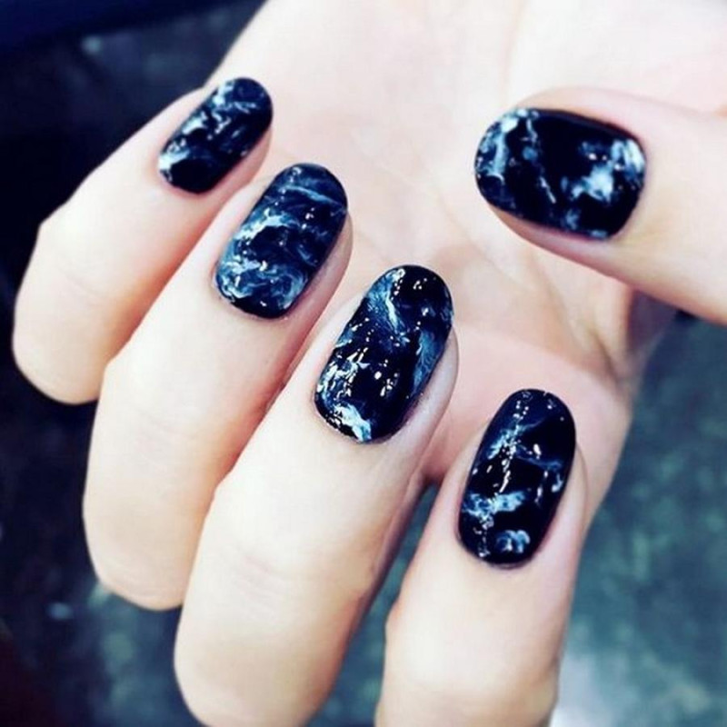 Бесконечный космос в каждом ноготке! Попробуйте создать такой космический дизайн мраморного маникюра с помощью темно-синего и белого лака.