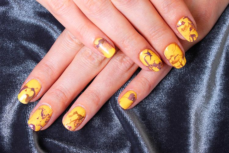 Летний и очень сочный вариант мраморного маникюра в желто-коричневой гамме.