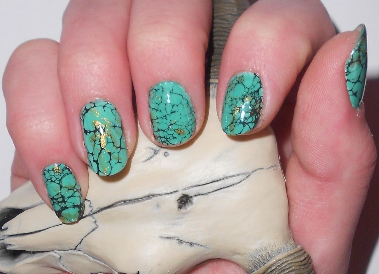 Такой яркий вариант мраморного маникюра придется по душе любительницам украшений из бирюзы.