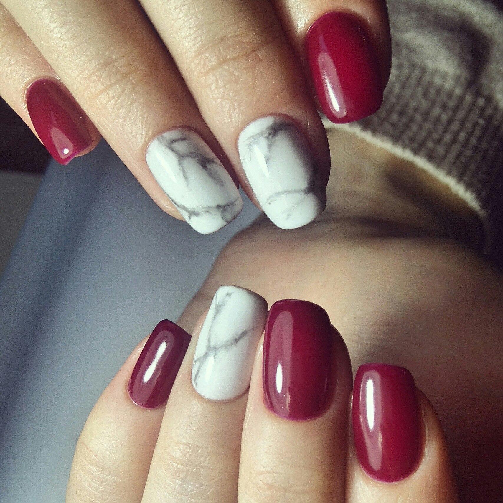 Красивый маникюр в розово-бордовом цвете с мраморным дизайном.