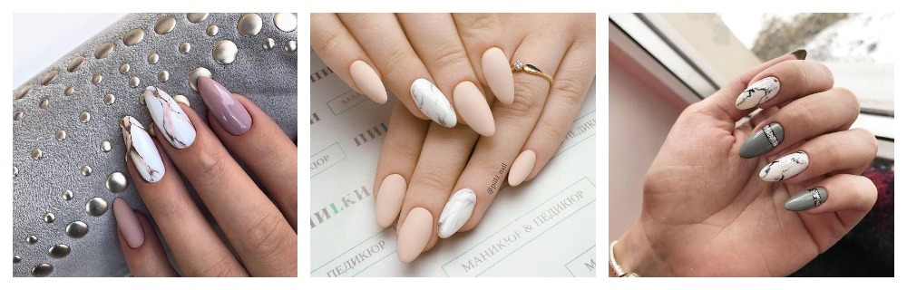 Мраморный маникюр на длинных вытянутых ногтях смотрится естественно в нежном нюдовой гамме. Ведь длинная заостренная или квадратная форма сама является украшением пальца. Нанесение на нее ярких сочных цветов лака с четкими прожилками или крупными пятнами разводов сделает образ хищным и вульгарным.