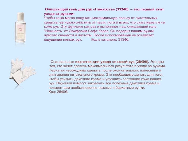 средств, её нужно очистить от пыли, пота и всего, что скапливается на коже рук. Эту функцию как раз и выполняет наш очищающий гель “Нежность” от Орифлэйм Софт Кэрес. Он подарит вашим рукам чувство свежести и чистоты. После использования не оставляет ощущения липких рук. Код в каталоге: 31346.