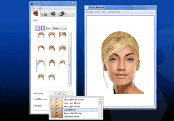 редактор jKiwi – одна из наиболее простых в применении программ. Моментально отображает любые изменения. Дает возможность примерить причёску и сотни различных стрижек с предварительным указанием цвета волос;