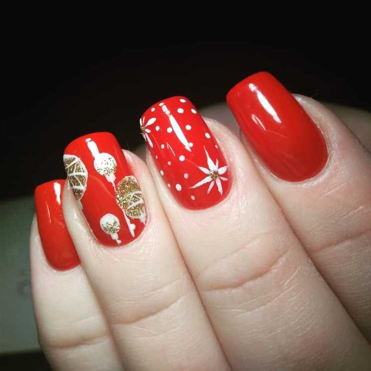– нет более праздничного новогоднего мотива, чем красно-белый маникюр. Снежинки и морозные узоры, Дед Мороз и подарки – в красно-белой гамме они выглядят очень нарядно;
