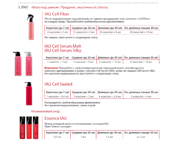 - увлажнение и фиксирование. Не смывая сыворотки, разделите волосы на пряди расческой и последовательно нанесите сыворотку-активатор IAU Cell Fiber, крем для увлажнения IAU Cell Serum Melt и для плотности – Cell Serum Silk. Затем массирующими движениями втирайте гель-масло «Влага под замком» по всей длине волос до полного впитывания. Промойте голову большим количеством теплой воды. Нанесите несмываемую эссенцию IAU и сделайте укладку.