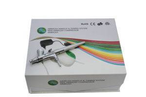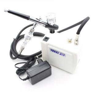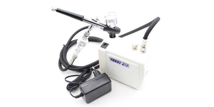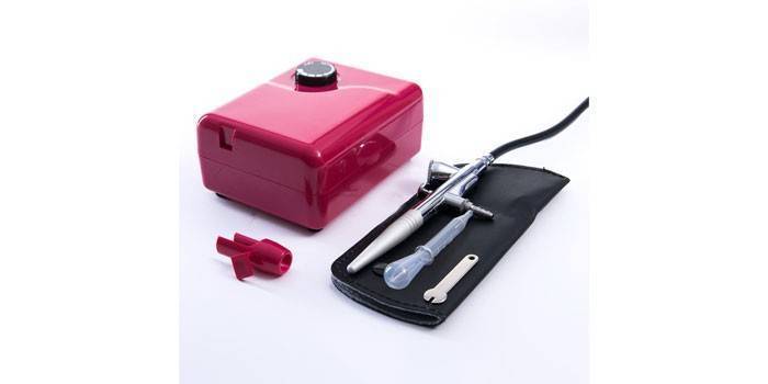 Стандартный набор для аэрографии на ногтях включает пневматический распылитель, компрессор и шланг. Производители, изменяя цену, добавляют в комплектацию зарядное устройство, трафареты, краски, пипетки и другие специальные принадлежности.