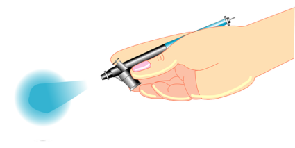Канал для подачи материала закрыт иглой. Краситель и воздух смешиваются при воздействии на рычаг, происходит распыление тонкого слоя пигмента на поверхность ногтя.