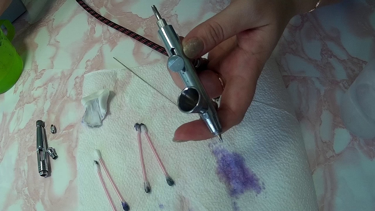 Мастера маникюра чистят аппарат после каждого дизайна. Это делается с помощью спиртового раствора или специального средства для растворения краски. Чтобы чистить аэрограф, разбирать его не нужно.