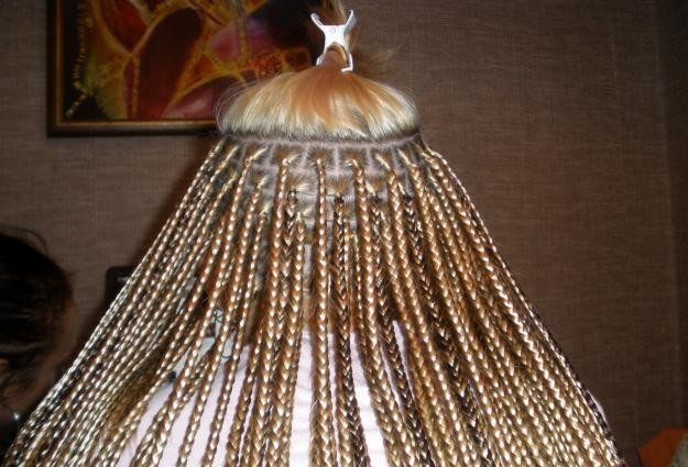 - Когда натуральные волосы заплетены, мастер переходит к наращиванию. В каждое звено косы продевается небольшая прядка и фиксируется узлом. Так продолжается до тех пор, пока вся голова не будет покрыта искусственными волосами.