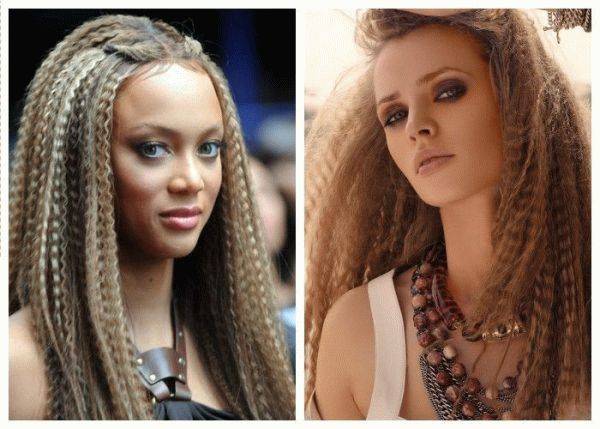 Современные афрокудри, предполагают крепление искусственных волнистых прядей на собственные натуральные волосы. Происходит это посредством предварительного плетения косичек. Они же выполнять роль каркаса.