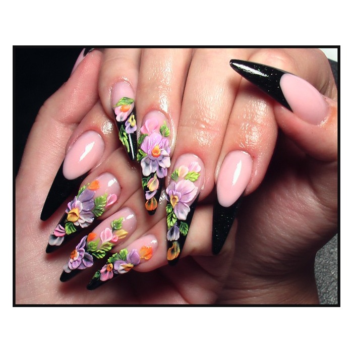 Необычный дизайн представляет собой создание объемных композиций с помощью акрила или геля. Маникюр прекрасно смотрится как на фото, так и в жизни. Нейл-арт получается очень красивым, но непрактичным, так как объемные элементы цепляются за одежду и окружающие предметы. Если дизайн создается для повседневной носки, поверхность ногтей с композицией покрывается специальным прозрачным гелем, создавая «аквариумный» эффект, что делает их идеально гладкими. Чем отличается акриловая лепка на ногтях от гелевой? Завершенные композиции получаются схожими. Разница заключается лишь в особенностях составов и технологии создания объемных элементов.
