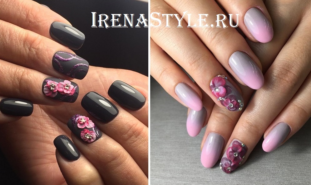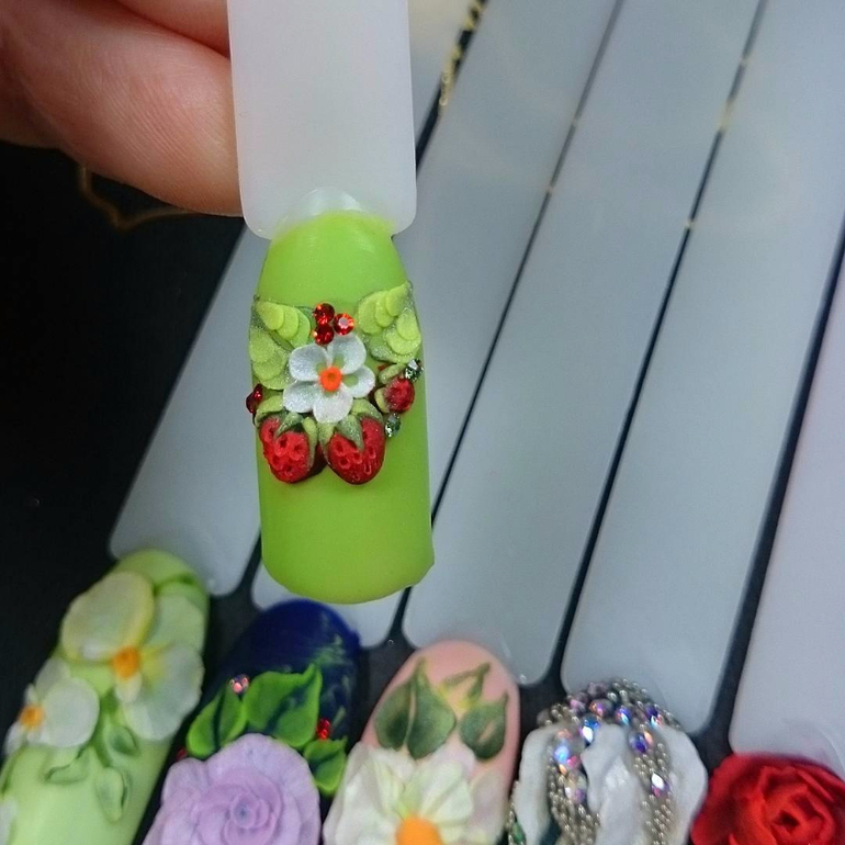 Наиболее сложный вариант, но в тоже время и очень интересный, при выполнении салонного маникюра, — это объёмный рисунок. Декор на плоскости переходит в объёмное изображение, продолжающее плоский элемент и тем самым создаёт интересный рельеф и глубину композиции