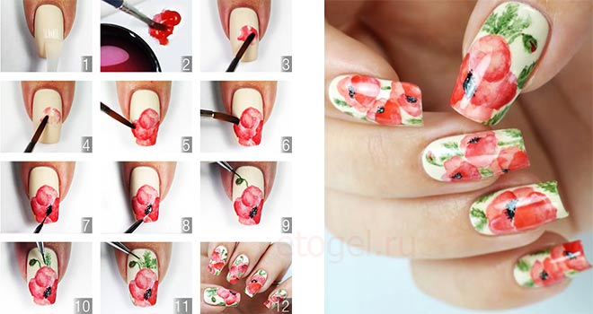 К вопросу, что рисовать, подходим, не ограничивая себя ни в чем. Меняя интенсивность краски, рисовать можно что угодно – от прямолинейной геометрии до акварельной размытости. Примеры работ и акриловые рисунки на ногтях пошагово смотрите в нашей фотогалерее.