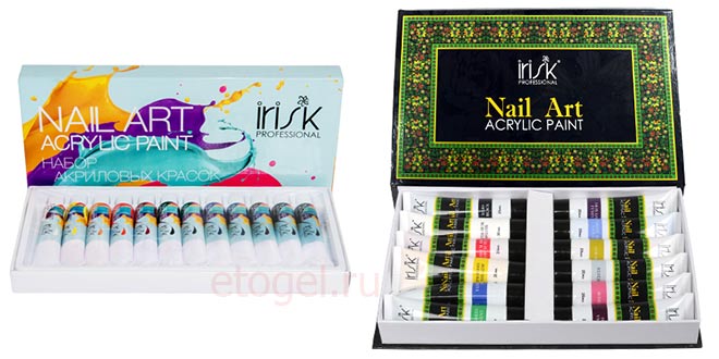 В ассортименте российской компании IRISK есть несколько наборов с акриловыми красками. Кроме базового «Acrilic Nail Art Paint», стоит отметить нарядную коробку с акриловыми красками для 3D-эффектов и китайской росписи с тюбиками увеличенной емкости (20 мл).