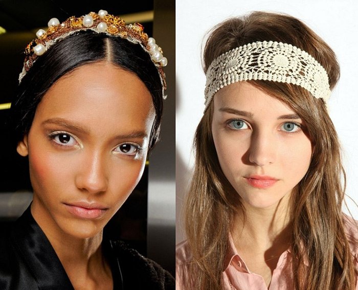 Повязки на волосы (тканевые широкие или тоненькие, похожие на шнурок) могут быть декорированы различными стразами, кружевом или полудрагоценными камнями. С их помощью делают прически в греческом стиле, или надевают на распущенные волосы разной длины в стиле хиппи.