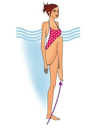 - Принять положение стоя в воде и поочередно сгибать ноги в коленках, стараясь достать пятками ягодиц. Повторить 10-20 раз.