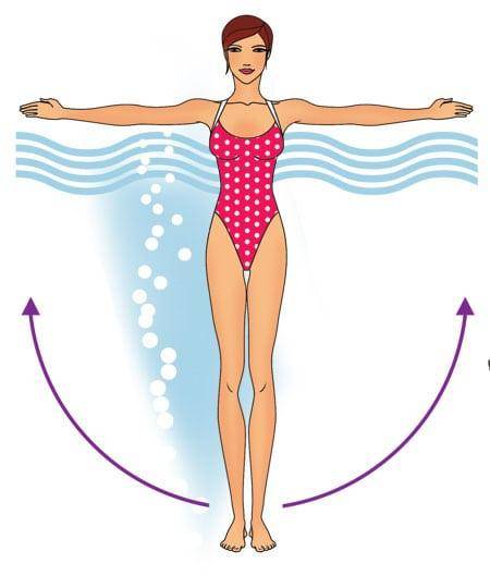 Вращения руками. Стоим в воде по шею. Делаем махи руками против часовой стрелки, а также вверх. Упражнение помогает укрепить мускулатуру рук и верхнего плечевого пояса.