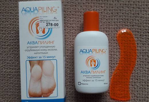 - Раствор Аквапилинг обладает мгновенным воздействием. Он способен устранить натоптыши за 15 минут. Жидкость наносится на поврежденный участок, снимается вместе с огрубевшей кожей специальным скребком, который прилагается в упаковке. При плотных мозолях, следует использовать раствор 3-4 раза.