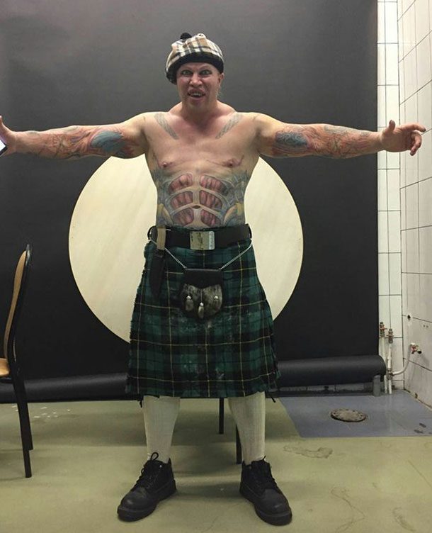 - он сделал татуировку, которая покрывает почти все его тело, полностью зарисованы ноги и спина, изображает скелет человека;