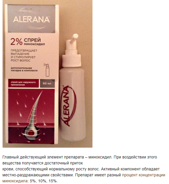 «Алерана» используется при выпадении волосяных стержней в области срединного пробора или на затылке. Может применяться 2% или 5% спрей.