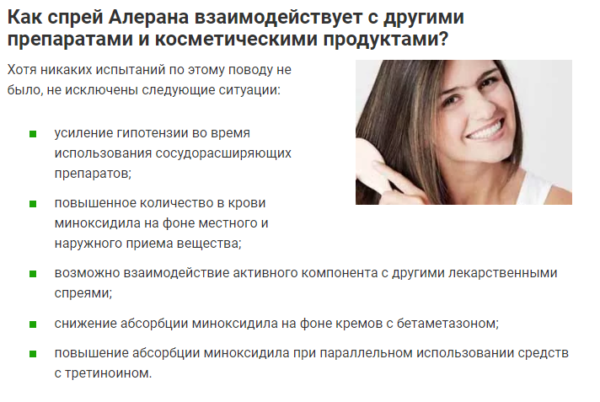 Алерана – это лекарство, предотвращающее потерю волос. Вне зависимости от того, использует ли покупатель спрей, шампунь или таблетки против облысения, после использования средства и при передозировке могут возникнуть нежелательные последствия, о которых изготовитель предупреждает заранее.