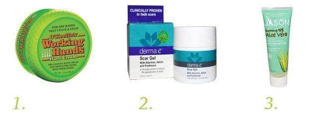 - Derma E, Гель от шрамов- Гель для рассасывания шрамов, растяжек и прочих дефектах на коже,клинически доказано: маскирует шрамы и снижает заметность бугорчатых, неровных, обесцвеченных шрамов, устраняет растяжки и выравнивает кожу после угрей.